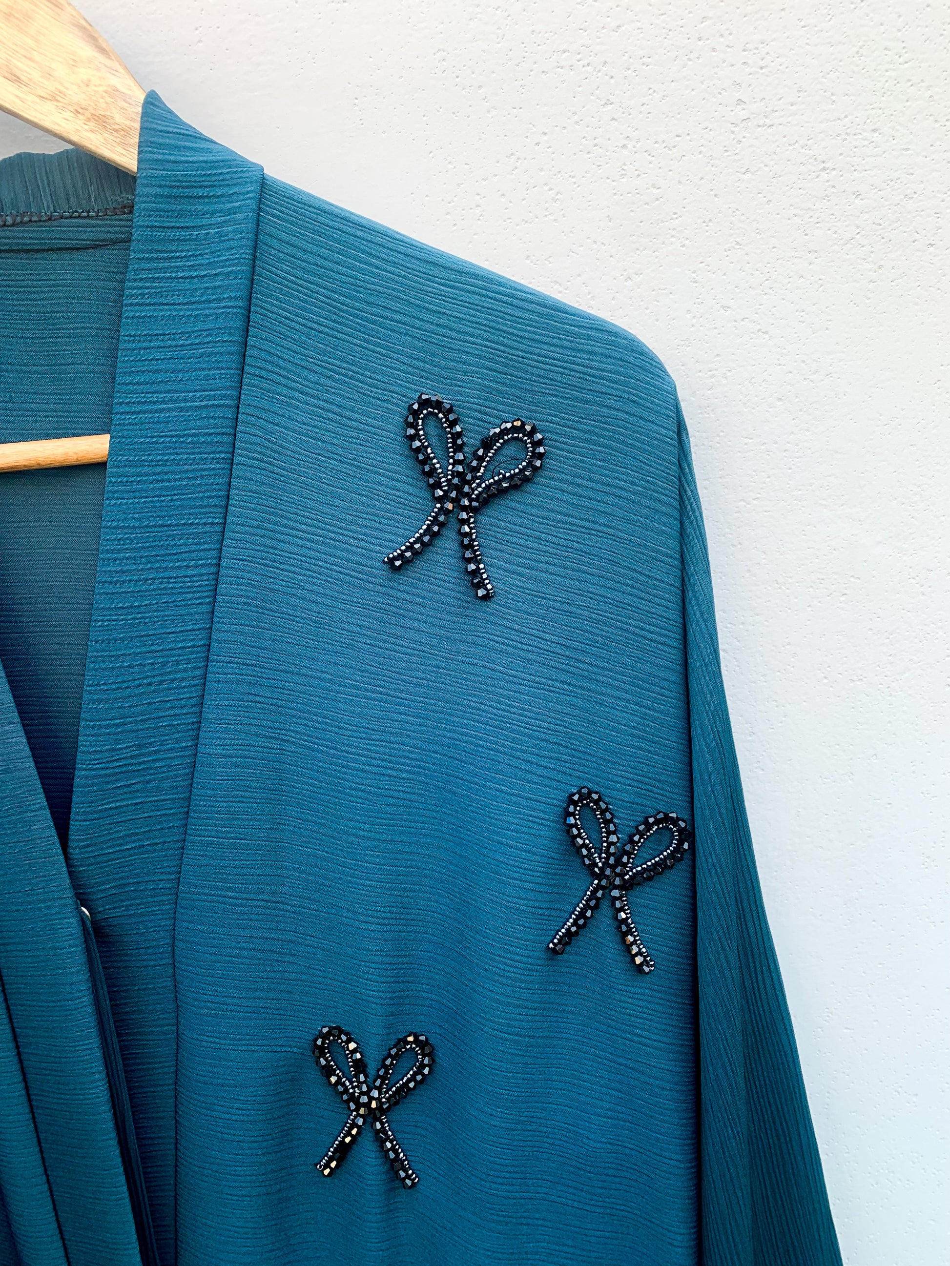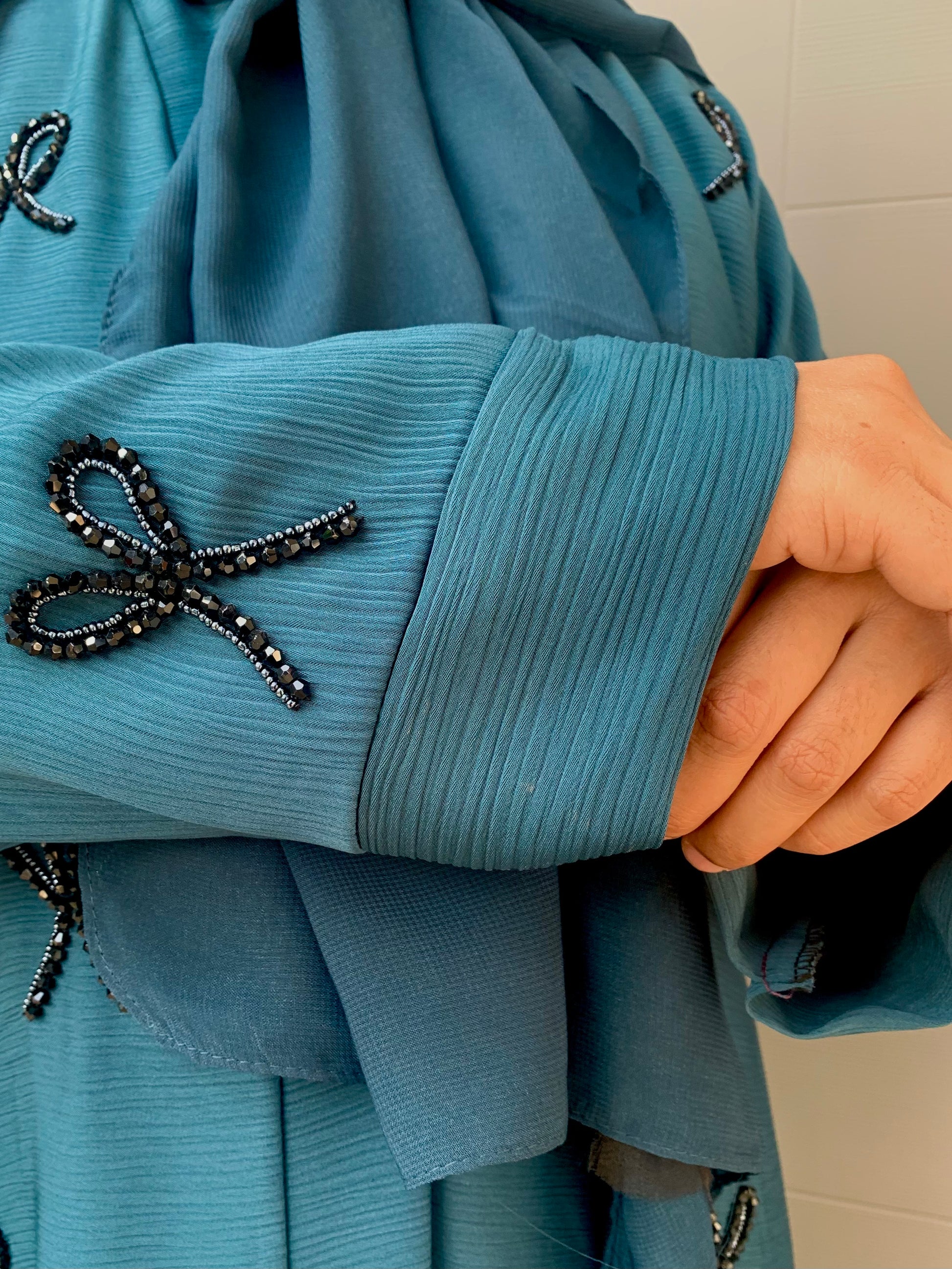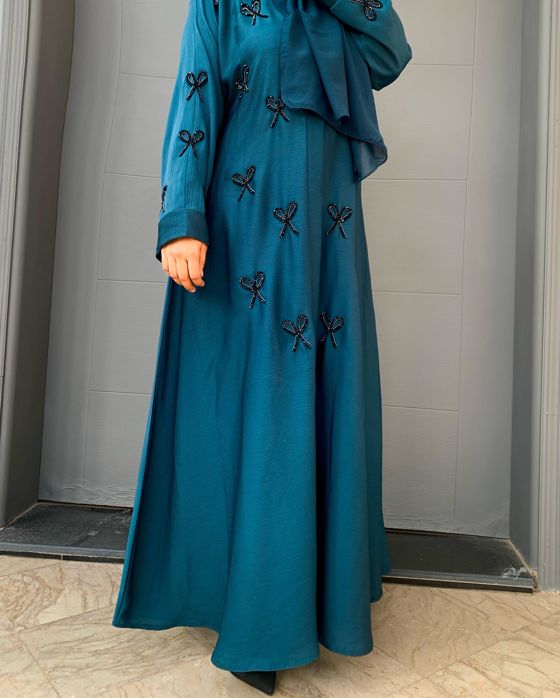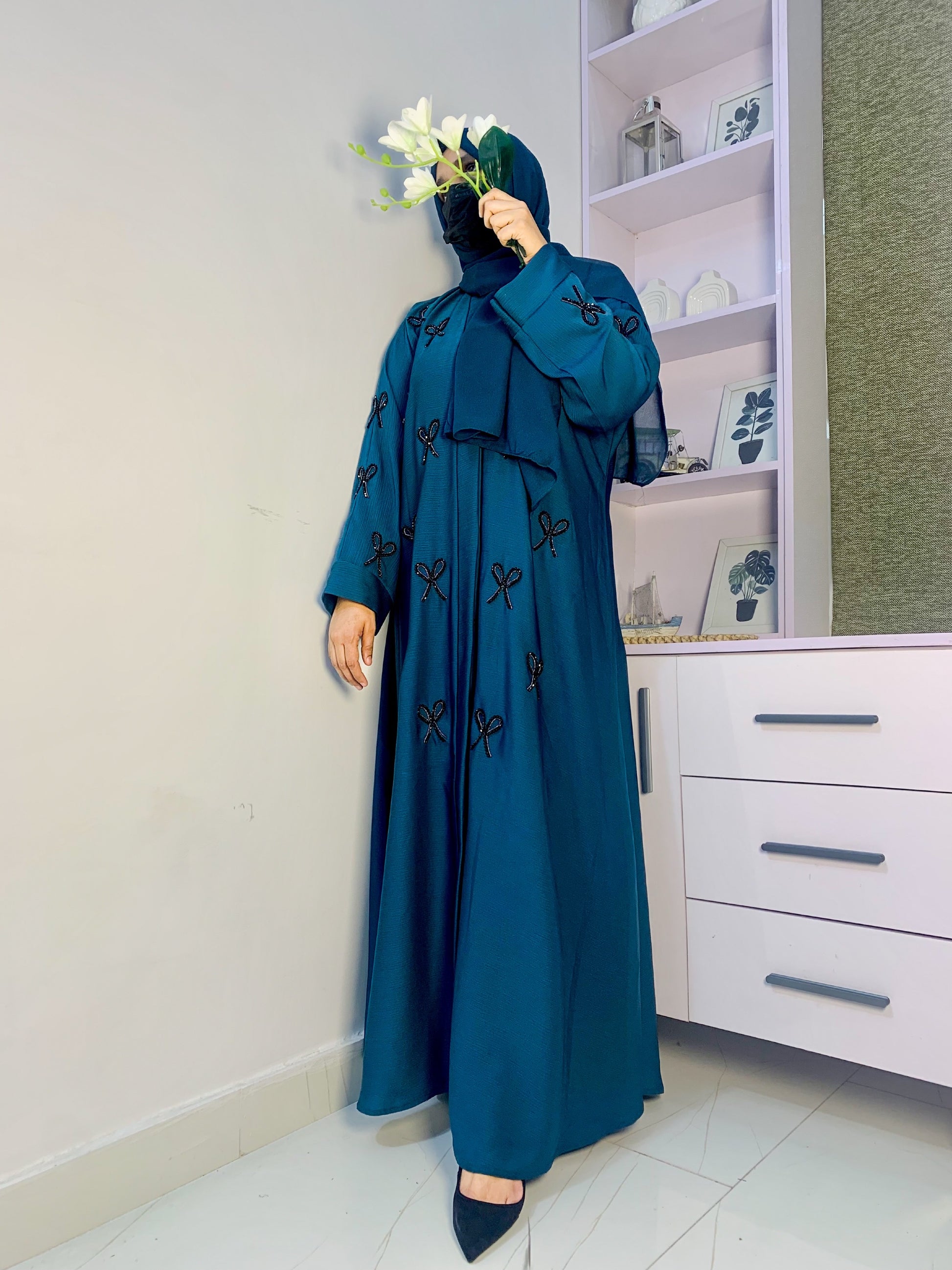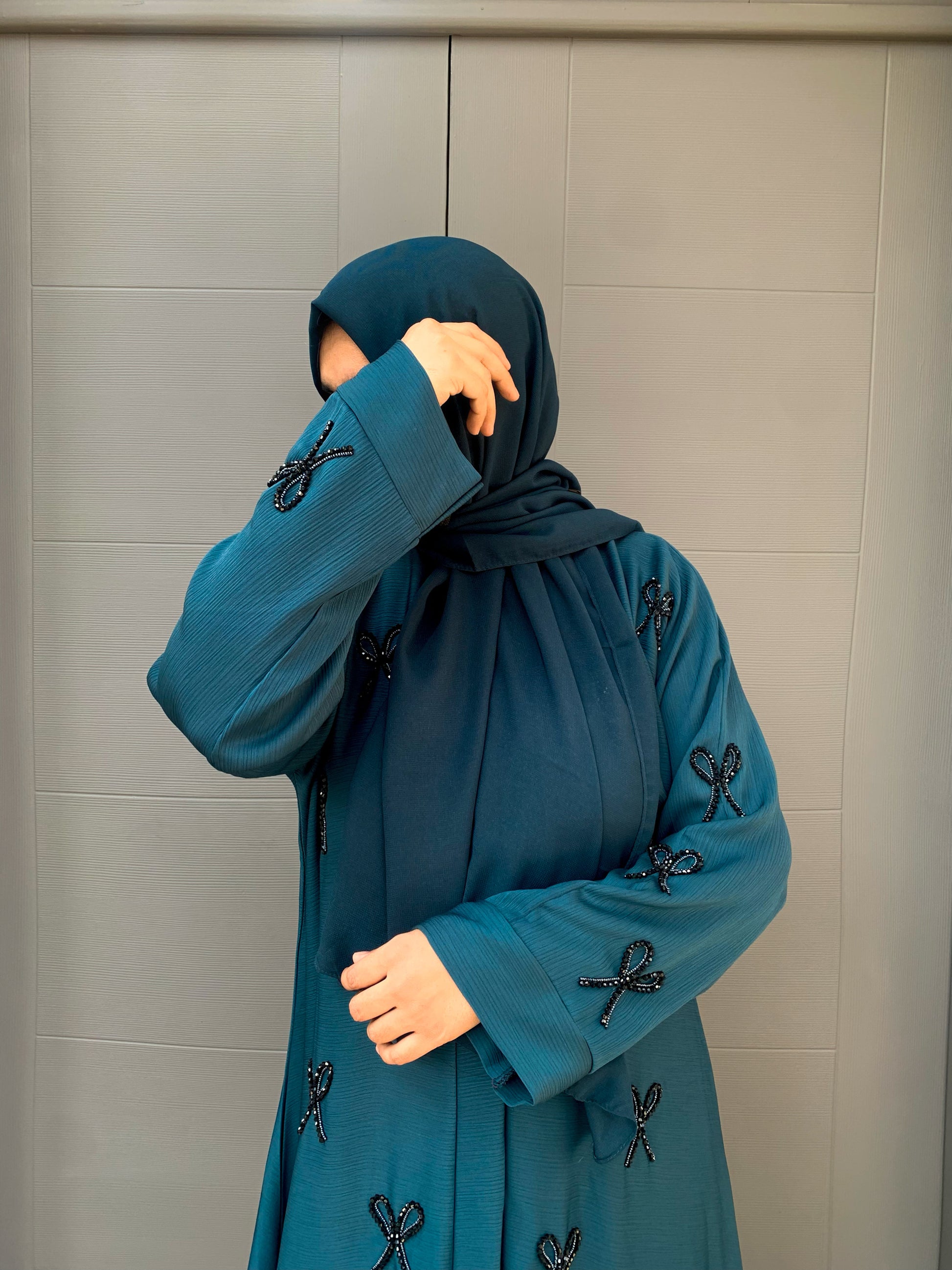 The Lux Teal Bow Abaya is designed to make a statement with its exquisite handwork and elegant bow detail. Made from premium Nidah fabric, this stunning teal abaya offers a perfect balance of sophistication and modern style, making it an ideal choice for formal and special occasions.