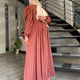 The Memel Maxi Abaya Peach Pink is made from premium crepe or chiffon fabric, chosen for its lightweight, breathable properties, and beautiful drape.